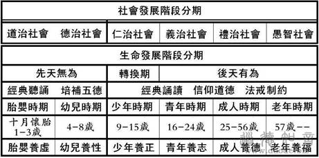 这六大阶段,我们上次已经提过了,它包括了道治社会、德治社会、仁治社会、义治社会、礼治社会到愚治社会这六个逐步下滑的阶段。对于我们人生来说,也同样具备这样一个六阶段的分期。也就是说,在我们每个人生命的早期,有一个先天无为期,接下来是一个转换期,然后进入一个后天有为期,这是我们生命的三大特征。