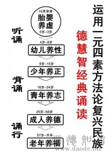 所谓“双可教育”,第一个“可”,那就是指开口诵读古代的经典,“道可道也,非恒道也。”诵读那些谈论大道、阐释大道、揭示大道的经典文章,就是经典诵读。另一个“可”,“名可名也,非恒名也。”就是说,你要主动呼唤,并把握住自己体内的性体系统,一性一命,对性体系统里边的“非恒名”,他们都有名字,你把握了他们的名字,经常去跟他们交流,主动跟他们建立精神网络上的反馈联系,就可以使他们主动获得能量,完成自我调节,从而达到一个自我教育的目的。