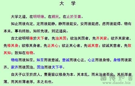 因为老子在《德道经》69章“昆成”篇当中,就说:“吾未知其名,字之曰道,吾强为之名曰大。”表述得非常清晰。就是说,那个虚无的“○”,那个处在虚当中,处在最高境界当中的那个无形却又有质的物质,在最高层次它就是“字之曰道,强名曰大”。“大”字是对“道”的强名,因此“大学”其实就是“道学”。要掌握这个“大”进行学习,进行实践,就称之为“大学”。而且,程子也讲过:“大学,孔氏之遗书,而初学入德之门也。”这个理解就离原著并不太远。也就是说,《大学》是一本教人怎样修习道德的入门之著作,是引领人们修养德性复归于道的理论和方法。