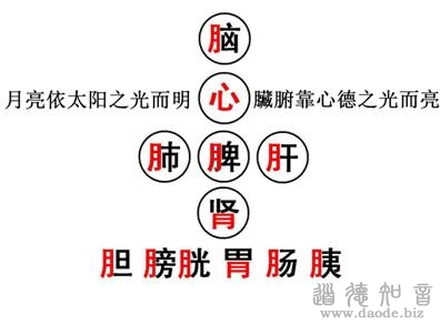比如,图中所有的字当中,大脑的“脑”,有个“月”字;“肺”,有个“月”字旁;“脾”,有个“月”字旁;“肝”,有个“月”字旁;膀胱、胃、胆、胰,都有一个“月”字旁,唯独这个“心”没有用 “月”字旁。因为,我们每个人的心都能够释放出一个光明的能量场。我们心场释放出光明的能量场,就是我们体内的太阳。
