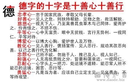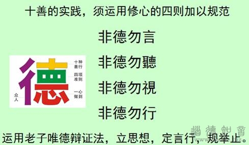 这个“德”,我们前边已经提到了,就是十种善行、四项准则,都要求能一心做到。这个“德”字,繁体的“德”,在国内说是繁体,在台湾说是正体。实际上这个“德”字,我们把握住了以后,基本上特别适用于现代,这就是到什么山唱什么歌。