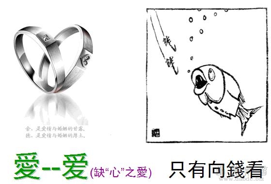 从现在的简体字,我们可以看出文化的滑坡。比如这个“愛”字,现在简写“爱”把中间的“心”就去掉了。不用“心”,那就只向钱看了,权就变成了利了,愿者上钩,只要有钱。网络上,那些富翁出几十万元选美、选老婆。即使选出来,过不了三年五载,热情过去以后,那可能就要换老婆了。为什么?因为他没“愛”嘛,他没有“心”,缺乏“心”的奉献,只有占有欲。被爱的小姑娘一方只有索取,随时随地地盯着老公的口袋里,怎么样把他的钱转到自己户头上来存起来,这就叫“爱”了。这种“爱”,不是永恒的,是自私的。所以,这样没有规范性地乱把字简化了,所带来的恶果是很大的。