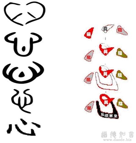 这个“心”字的演变,在早期的时候也很简单,到后来就逐步地复杂化了,最后三心开始分开了。真正获得智能阴我心主事,并且私欲贪心妄想执着,成了一个钩子,贪欲和私心妄想执着就成了钓鱼钩,使这个心,三个我被它包裹了,这也是我们现在写简体的情况,跟这个文字的演变也很有一些关系。