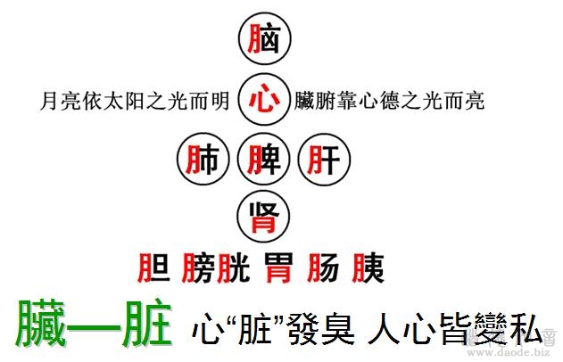 《黄帝内经》,这是一部中医学的经典,它里面也反应出一些造字的科学性。像我们体内所有组织器官,只有“心”字没有“月”字旁,为什么呢?其它所有的三焦、五臟六腑,全部带着“月”字旁。因为人心是要发出光明的,我们每个人的心,都应当像太阳一样发出自然(燃)的光明,来照亮我们自己的体内。我们很多人如果闭着眼内观身体里面,看不到什么,两眼一抹黑,但是具有图文思维能力的人能看得到,因为他心的能量在燃烧,叫道法自然(燃),它一燃烧起来,其它像脑、肺、脾、肝、肾,都像月亮,借着这个太阳发光。所以说,古人在造字上非常科学,也非常地严谨,是根据慧观下“知至”其本的生命科学理论来进行阐述的。有些人说中医不科学,我曾经在中国科学技术信息研究所向国家中医药发展战略课题组作了一场报告,讲的是,中医目前是世界上最科学的学科,原比西方医学要杰出得多,只是现在没有人能够读懂她而已。而且,用西医的观点去解释中医,越解释就越出问题。实际上,真正要了解中医,还得从老子的思想、从黄帝的思想中去把它扶正,那才容易解决这个问题。比如,这个五臓的“臓”,现在被改成“脏”,人人心里都脏透了。所以看医书的时候,自己心里面都发酸,怎么都改成肺臓也“脏”了、肝臓也“脏”了、脾臓也“脏”了,全部都脏了,所以看到这个字,头都大了。其实,从字里面的变化就反应出我们现在离道失德的状态了,那的确是非常地严重,亟需要道德文化的营养和滋润。