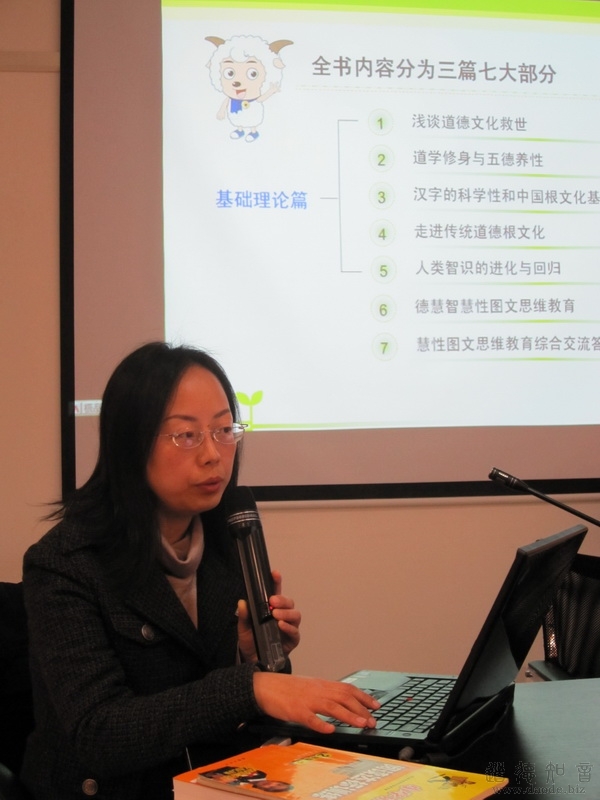 老子学院学生朱进女士,则通过自己对此书的学习体会,将熊先生的理论给大家作了一次立体梳理,利用自己制作的PPT,将熊老师《慧性图文思维教育——别把孩子教笨》这本书的内容,以幻灯片图文并茂的立体方式,引领大家一起畅游老子的根文化园地,让读过此书的读者印象更深刻,并有了全新的理解,让还未读过此书的观众心神向往。