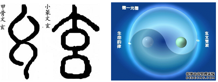 老子说:“玄之又玄,众眇之门。”这个“玄”,被不明真相的后人虚无化了。其实在20世纪初期德国的科学家,爱因斯坦的老师普朗克提出了量子论,以及爱因斯坦提出了相对论以后,就容易地揭示出中国古代幾学的奥秘。祖先们早在几千年之前就谈到了这两个“玄”——双螺旋结构能量的韵动形态。最早期甲骨文的“玄”字,很形象地表现出这个双螺旋的能量是通天的。到了小篆的“玄”,为了表述得明显,就在上面加了这么样一个横。后来在太极图里面,我们可以明明白白地看到S玄。