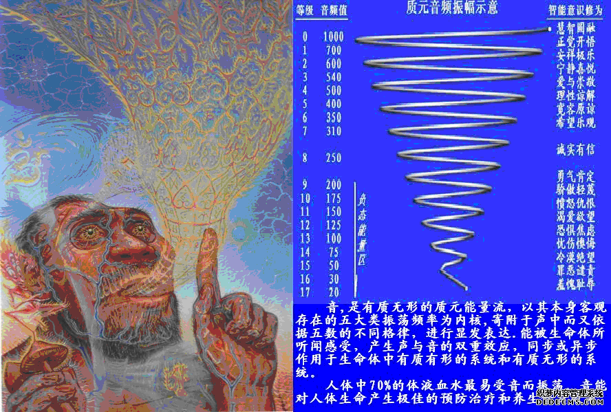 对于这个“音”,最早期的人类通过“声”来发“音”,通过“天目”来产生能量光和音的结合,实现一种比较理想的状态。《德道经》里面就存在着用“音”的奥妙,在诵读时可以达到不同的振荡频率,最高频率甚至可以达到一千赫兹左右。这是根据国外的学者对常见的音所进行的一个分析。